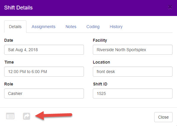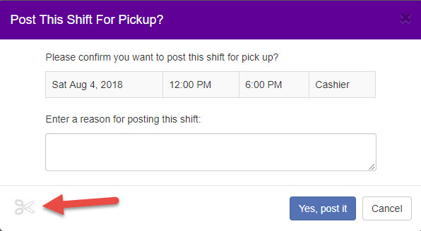 Note: Partial posting of shifts can depend on whether your manager has made the role non-postable or the work assignments attached to the shift. If the scissors icon does not appear please contact your manager to find out what settings he/she has defined.