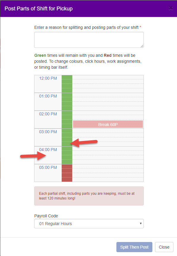 Note: Your manager has set preferences on your system regarding the posting of partial shifts. It is up to management to decide whether partial shift posts are permitted. Please contact your manager, if you are having trouble posting part of your shift.