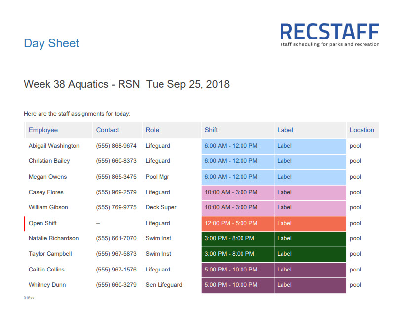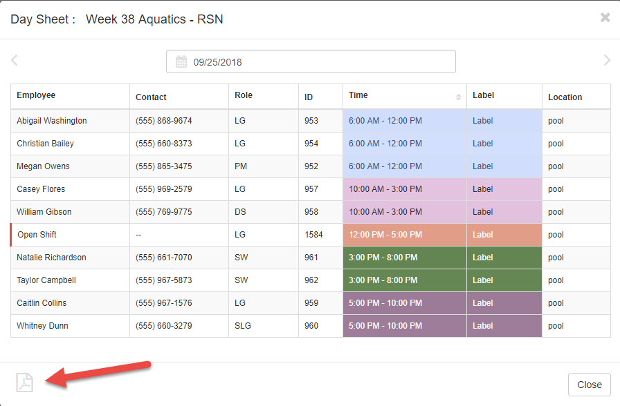 4, When you click on the Day Sheet icon the shifts occurring on the chosen day appear. You can click the backward and forward arrows to change days