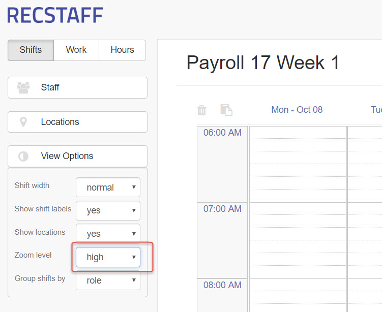 Note: You can also change the Work Tab Zoom Level which is independent of the zoom level you have set on the Shift tab.