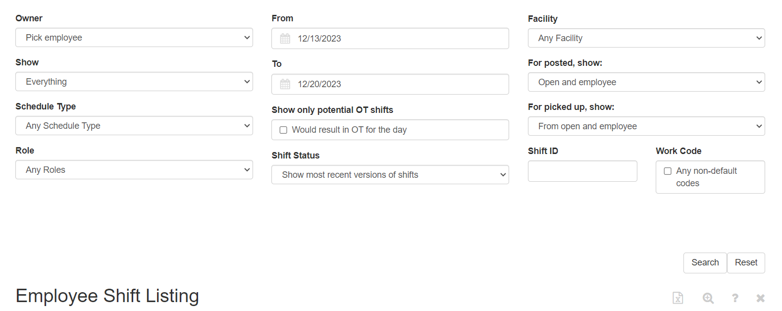 The shift listing report allows you to slice and dice shift and hours worked information and export to an excel spreadsheet.