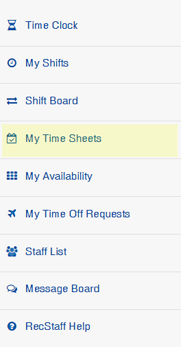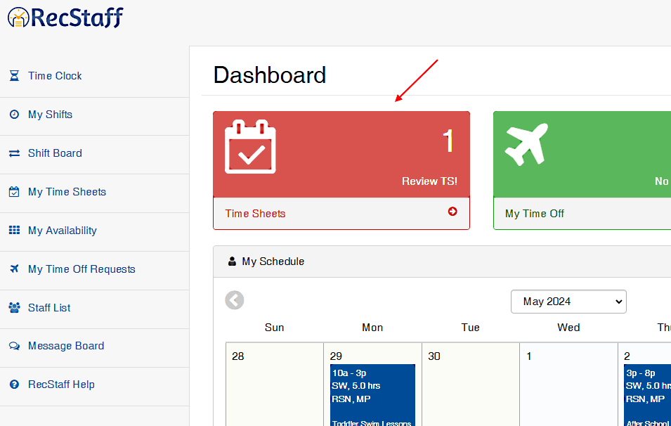 You send the timesheets out to staff for review (from the Timesheet Listing page) and the next time an employee logs in to RecStaff they will see a large red icon indicating there is a timesheet waiting for them: