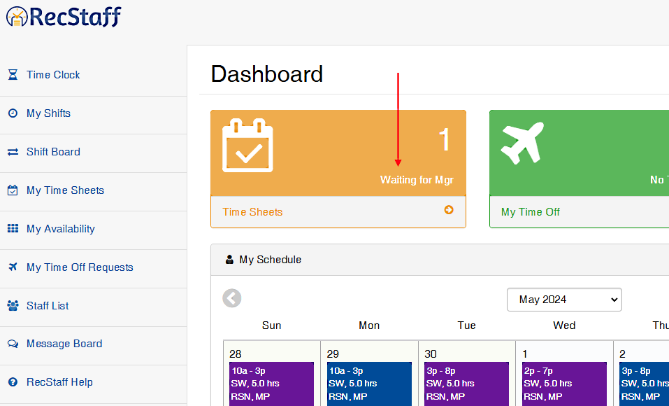 Note: once the employee has sent it back to you with a question, the indicator icon on their dashboard will turn yellow and show that the timesheet is waiting for manager review: