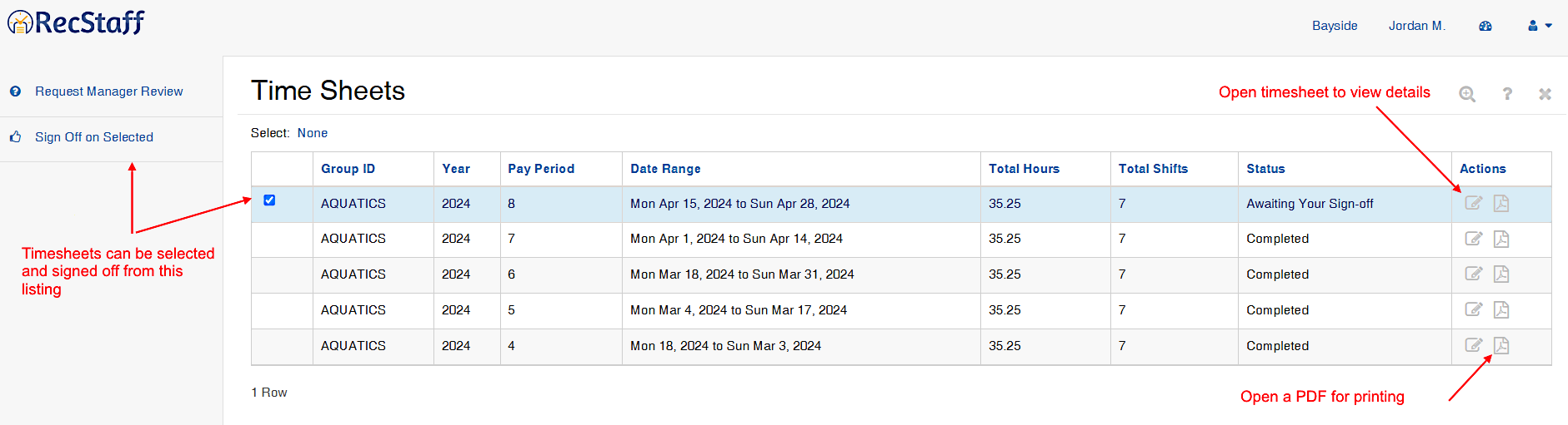 The most recent timesheet will be at the top, with the status showing as "Awaiting Your Sign-Off":