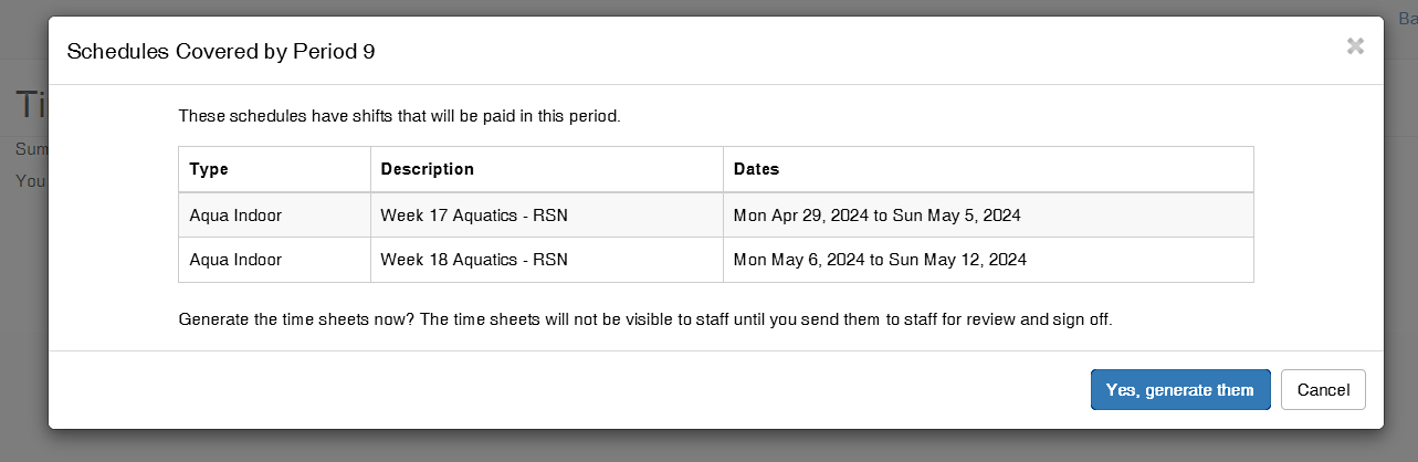 The dialogue shows which schedules it is going to pull shifts from to generate the timesheets. Note that you CAN NOT change the list of schedules here; the system has found the schedules that are associated with your payroll group and the dates of the period you've created. This is meant as a quick check - if you see the wrong schedules here, or don't see a schedule that should be here, then you need to adjust your payroll configuration.