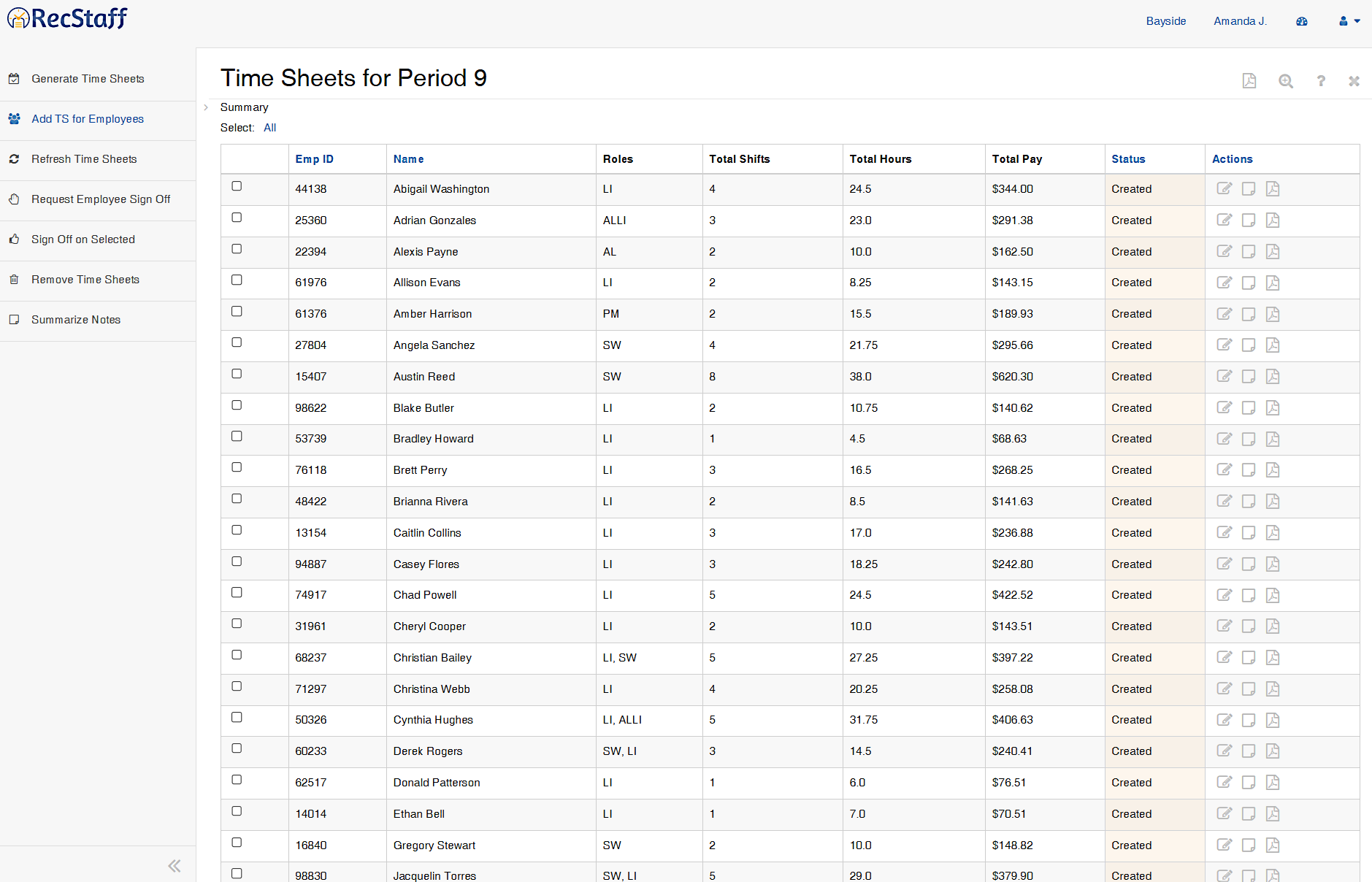 The timesheet listing is like any other listing page in RecStaff. If you want to do something with a specific timesheet you can click on the icons on the right side of that timesheet's row - view/edit (pencil), view notes (sticky note) of view PDF. If you want to do something with several of the timesheets you can select them (or All) and the menu options on the left will become active.