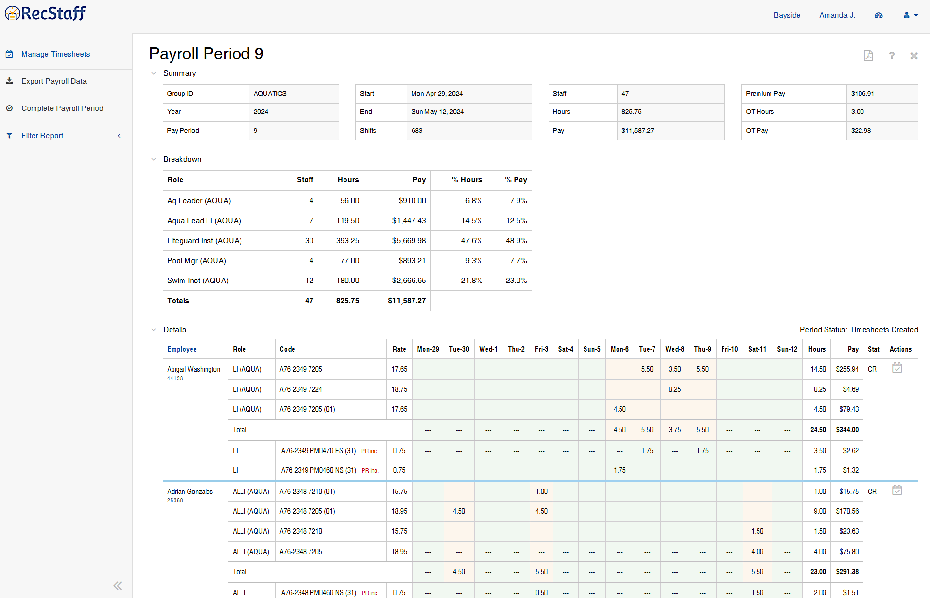 When you click the 'X' to leave the Timesheet Listing, you return to the Payroll Period Report which will now be populated with all the date from the timesheets: