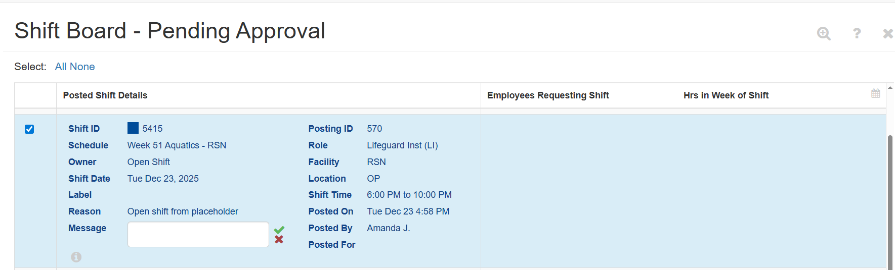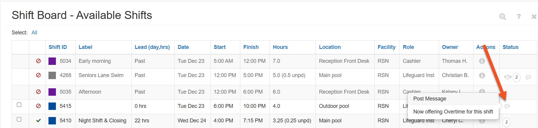 Note: The message will appear on Staff Shift Boards under the Status column. It is the same message field employees use to communicate with their co-workers about shifts they've posted.